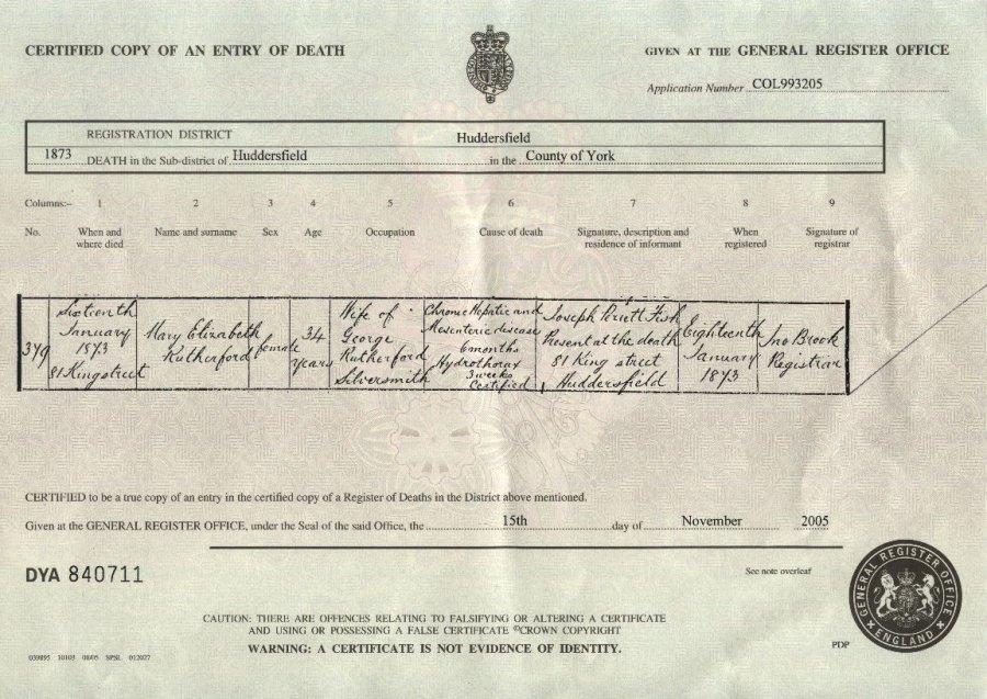 Death Certificate 1873 M E Rutherford