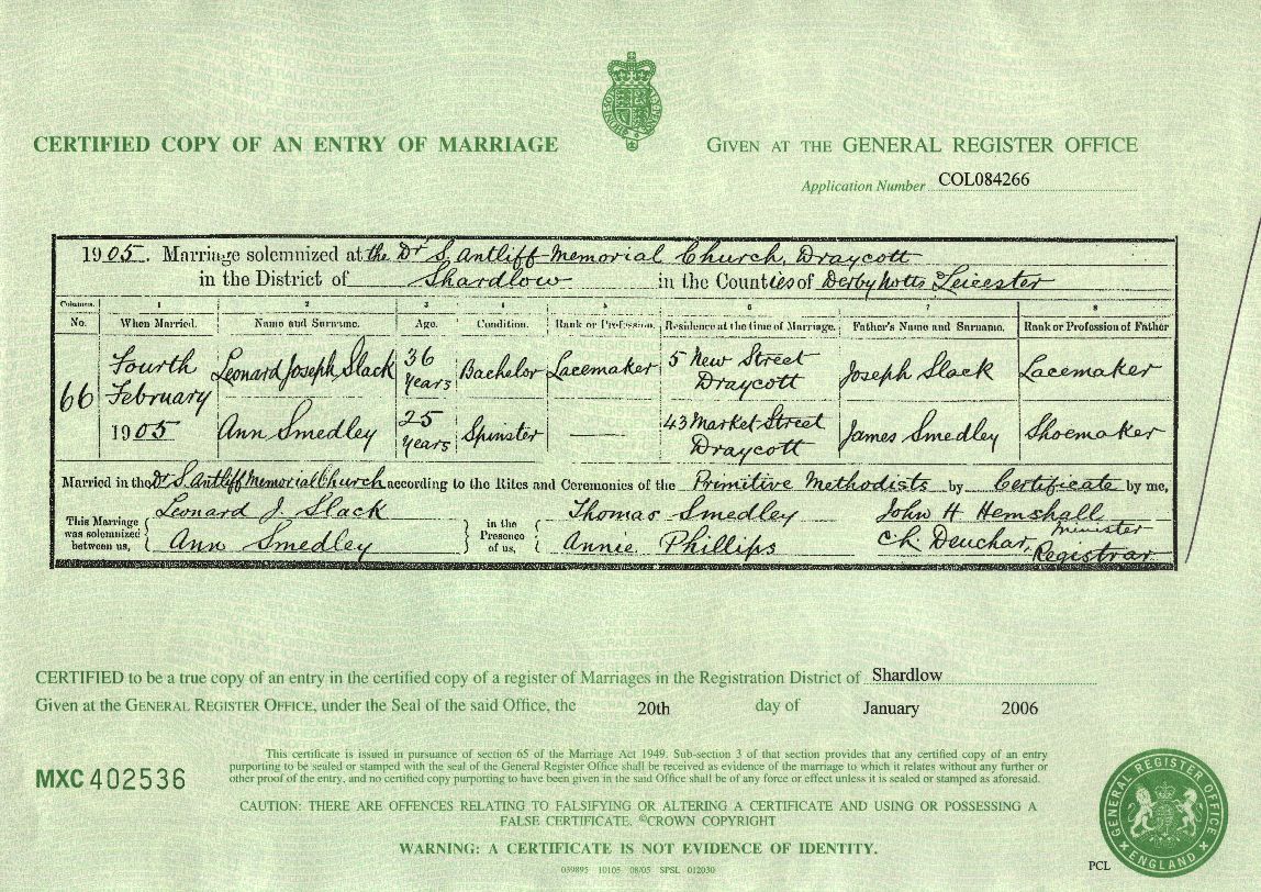 Marriage Certificate 1905 LJ Slack = A Smedley