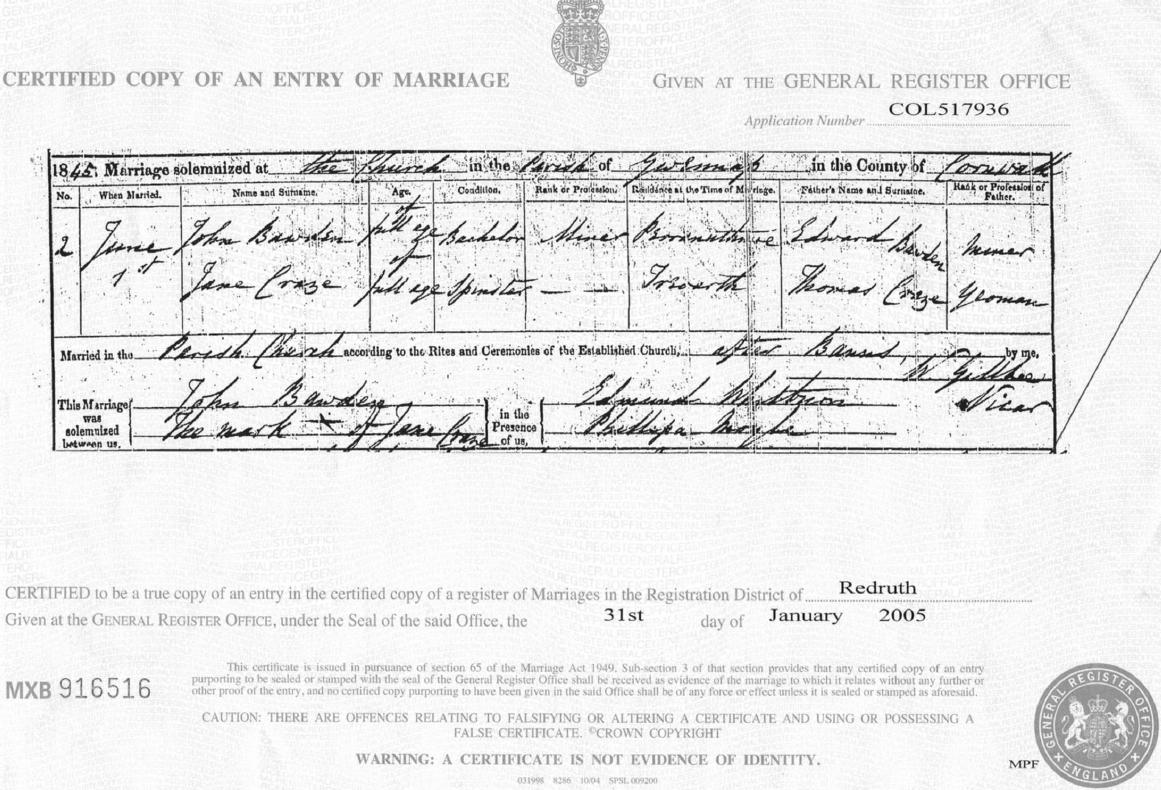 Marriage Certificate 1845 J Bawden = J Craze