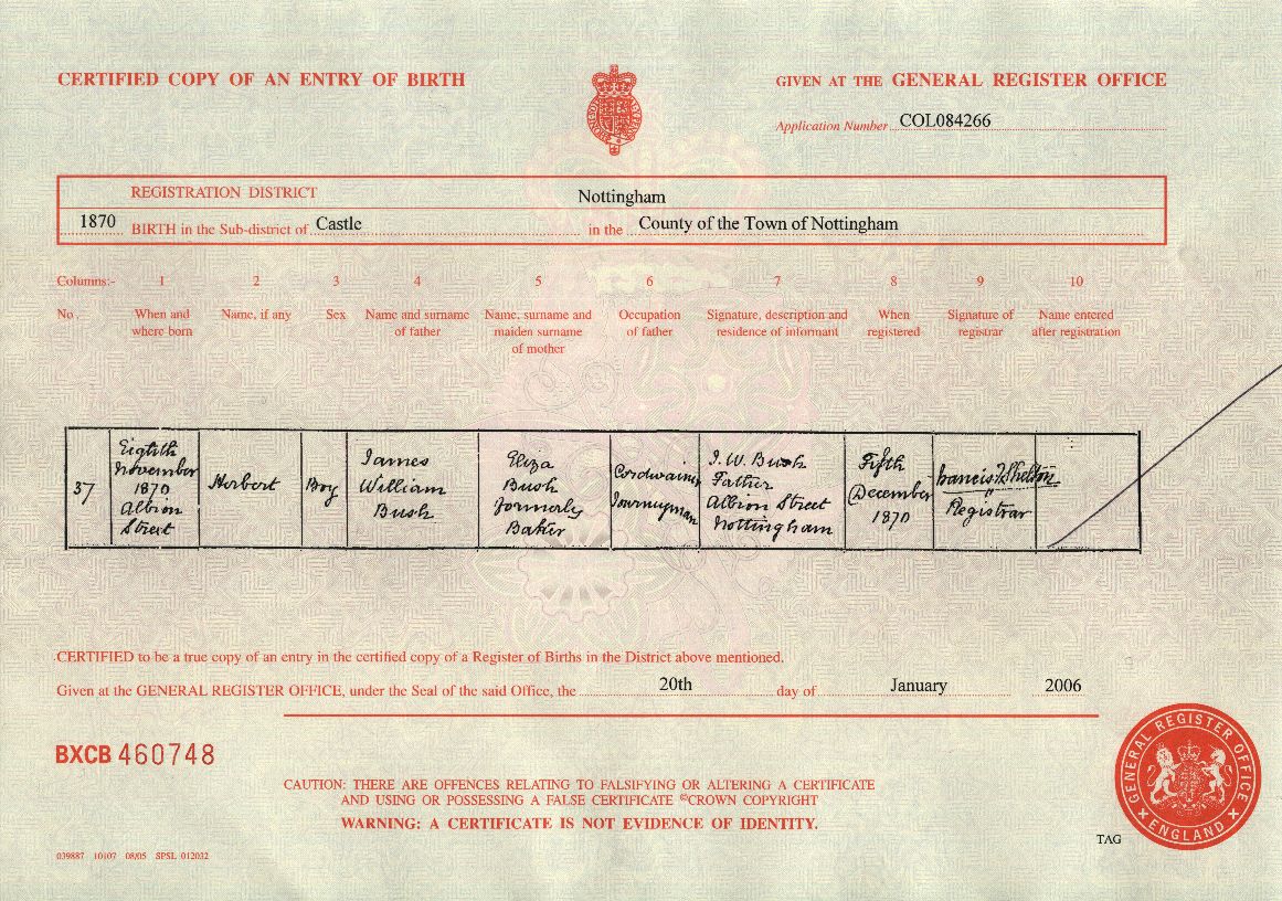 Birth Certificate 1870 H Bush